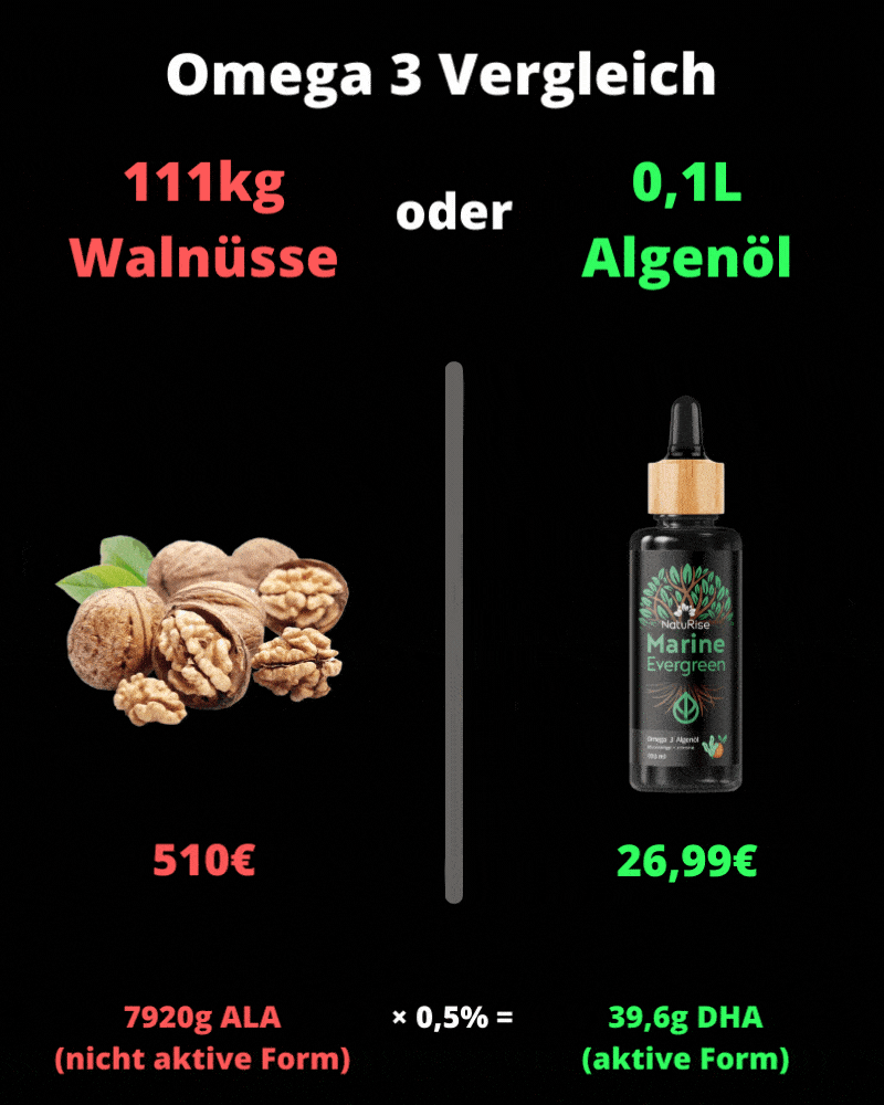 a) ALLE anderen pflanzlichen Omega 3 Quellen (Walnüsse, Rapsöl, Leinöl, Hanföl, ...enthalten 0g EPA&DHA! Algenöl ist die einzige, pflanzliche Quelle für EPA&DHA.²² Somit werden diese Lebensmittel deinen Blutdruck, Blutfettwerte, Sehkraft, Herz- und Gehirnfunktion NICHT positiv beeinflussen.²³ Sie enthalten nur die nicht aktive Omega 3 Fettsäure ALA.²⁴ Diese kann nur in sehr geringen Mengen (≈0,5%) in DHA umgewandelt werden.²⁵